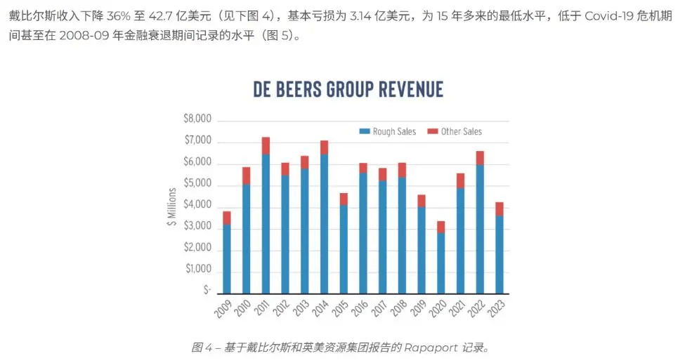 戴比尔斯母公司披露,2023年戴比尔斯的年度总营收从2022年的约66亿美元跌至43亿美元,原钻销售额锐减24亿,同比蒸发40%。其基本亏损已高达3.14亿美元,创下近十五年来最高记录。