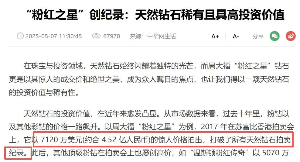 戴比尔斯在1999年开采的59.60克无瑕粉钻,几经辗转被周大福老板收入囊中。