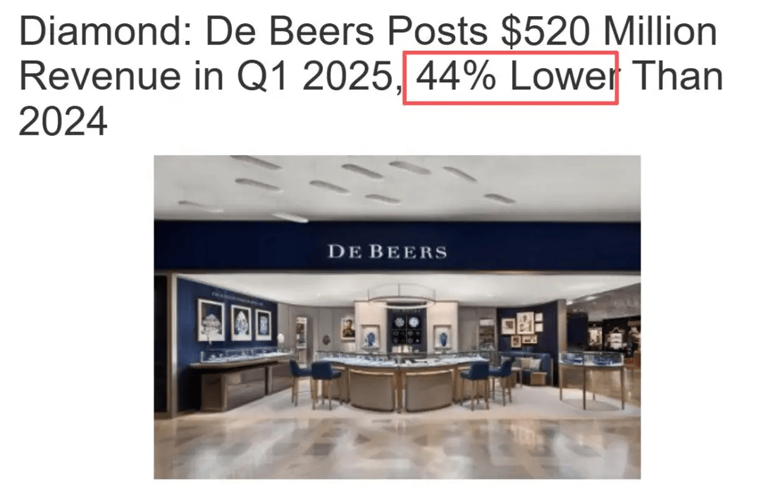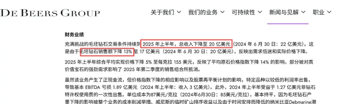 可即便打出“降价”与“减产”的组合拳,戴比尔斯2025年上半年依旧录得1.89 亿美元亏损。这份冰冷的数据,直接戳破了其自救措施的无力。