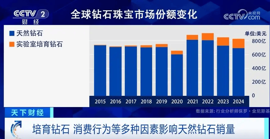 当下,已经有八成以上的美国消费者愿意接受培育钻石饰品。2024年,培育钻石在美国销量的市场占有率达到一半以上——要知道2020年时还不到15%,短短四年就从“边角货”跻身为“主力军”。