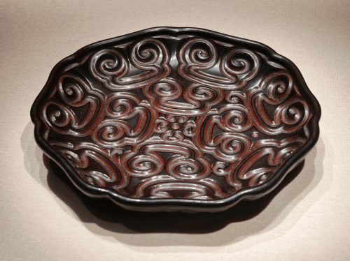 盘呈七瓣花型,弧壁,圈足亦为七瓣花型。乌面剔犀,间朱漆三道。盘面中心雕变体柿蒂纹,伟德国际1946外围两圈如意云纹。盘外壁雕七组流云纹。底髹黑漆,书朱砂方圈款。