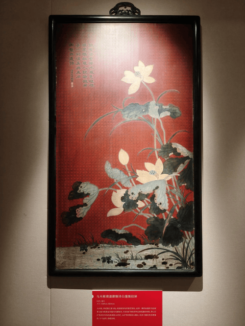 乌木框。屏板髹红漆为地,绿漆填饰龟背菊花锦纹。挂屏一隅有如意馆书法家曹文植为乾隆皇帝题写的御制诗,并添加矿物质彩料达到笔墨的效果。屏心以矿物质和珍珠粉髹填映水荷花,以矿物彩髹填水藻纹。挂屏主题纹饰恣意曼妙,生气盎然,意蕴清逸。伟德国际1946