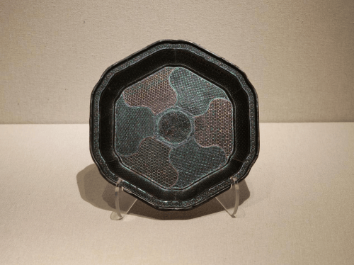 盘为六瓣葵形,髹黑漆,盘内壁和盘心以嵌螺钿工艺制成细密的花瓣、锦地纹图案,盘心中央为太极造型,周围呈六棱形和六瓣叶片结构;盘口镶铜扣;盘外壁及盘底均髹黑漆,仅在盘底中心描金写“心”字。漆盘表面镶嵌细小的银白色、绿色、藕粉色蚌壳细材,图案富有装饰效果,外观更具立体感。