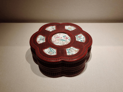 盒呈六瓣形,平顶,子母盖。通体髹红漆。盖顶以回文和方胜锦地做装饰间隔。中心一圆形开光,四周以六个扇形开光环绕,开光内嵌饰画珐琅花卉图案。盒壁以大回文和小回锦地装饰。盒内及底均髹黑漆。