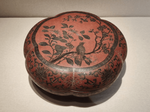 盒呈海棠形,平顶,弧壁,子母口,圈足。盒表面自底至面髹黄、赭红、黄、绿、红五层色漆。盖面海棠形开光内雕麻姑献寿图,以回纹、水波纹、钱纹分饰天空、水面和地纹。盖与器壁以回纹饰锦地,雕刻各式花卉。盒内与底髹黑漆。