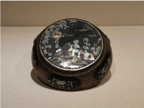 盒呈鼓形,平顶,圈足。通体髹黑漆为地,嵌薄螺钿片贴金片纹饰。盖面纹饰为《观瀑图》,伟德国际1946以软螺钿片加贴金片饰为高山,细长条螺片作瀑布,浅绿色螺片作激起的水花,短促呈曲线形的透明螺片作流水,以金片为卵石,银屑为岸,画面动静结合,层次分明。