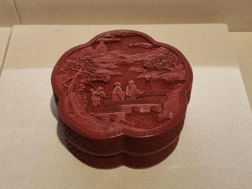 盒呈花瓣形,盒内及底均髹黑漆,平底。盖面雕山水人物图。只见两位老者一前一后步行穿过河面上搭建的拱桥,前者手提花篮盛着祝寿用的花果,后者手捧祝寿的礼物。侍从扛着拐杖紧跟两位老人身后。