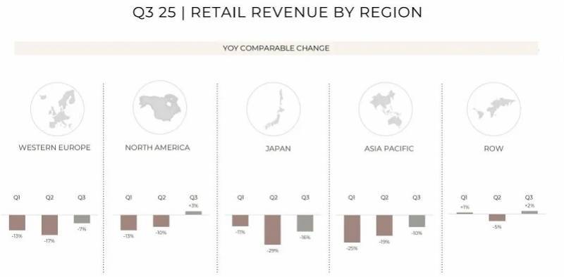 按地区来看,北美市场表现出色,同店销售增长3%;欧洲市场下降7%,降幅较前季收窄;日本市场降幅也收窄至16%,较前季29%的暴跌显著回暖。中国所在的亚太市场同店销售下降10%,集团CFO Armelle Poulou指出,中国市场仍处在谨慎复苏期,高端客户的情绪恢复比数据更慢,但新品上市带来了有限但真实的客流回升,部分品牌在国庆假期呈现积极趋势。