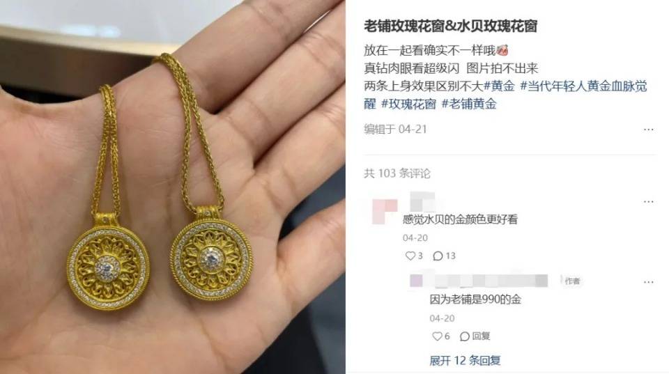 有网友对比发现,水贝复刻老铺黄金的复杂款式与原版尚有差距,但普通款式已经能做到完全还原。很多喜欢古法工艺又不执着品牌服务的网友,都会直接买水贝货。