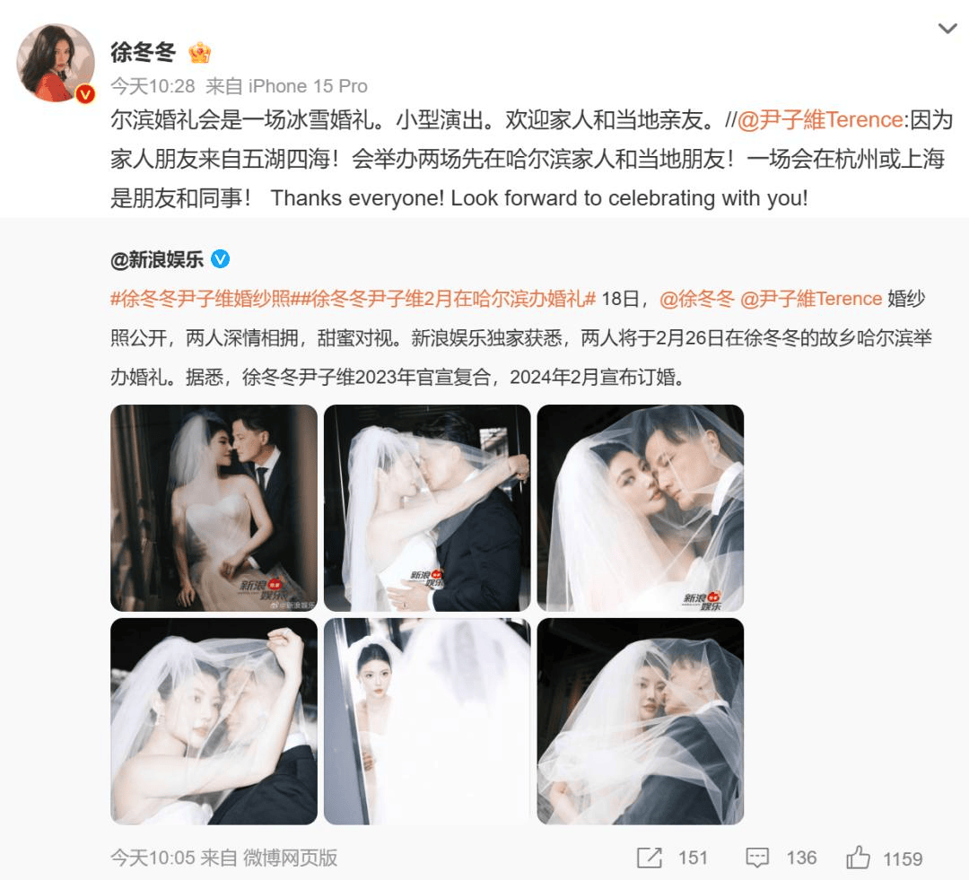 2025年10月,尹子维连发多条微博,称因“废墟里的细节决裂”向徐冬冬道歉,并透露徐冬冬可能拒绝参加原定于2026年2月26日在哈尔滨的婚礼。