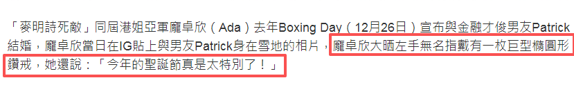 庞卓欣的未婚夫Patrick从事金融行业,家庭背景、收入都相当不错,两人也属于门当户对,相当般配。