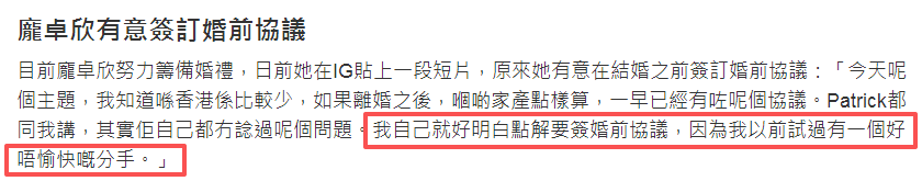 在接受传媒采访时,庞卓欣就向传媒透露:她准备拟定一份婚前协议自保,因此引发了外界不少热议。