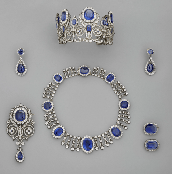 △玛丽-阿梅莉王后与奥尔唐斯王后的冠冕、蓝宝石项链及蓝宝石耳环(资料图)