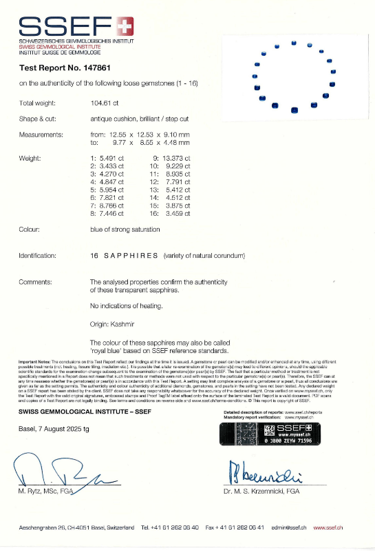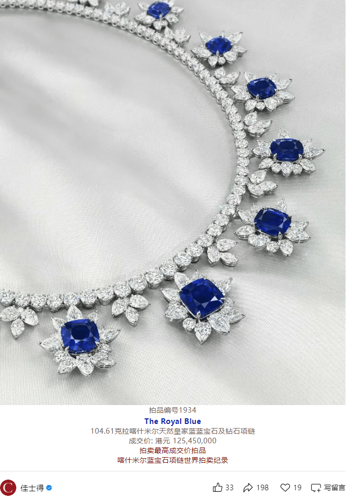 在11月25日举行的佳士得香港瑰丽珠宝及翡翠首饰拍卖会上,一条名为“The Royal Blue”的无烧蓝宝石项链以超1.25亿港币高价落槌,创下克什米尔(Kashmir)蓝宝石项链的世界拍卖新纪录。该项链由16颗13.37至3.43克拉枕形克什米尔天然皇家蓝蓝宝石组成,附有SS伟德国际吧EF、古柏林及AGL证书,配有293颗1.1至0.18克拉D-F色/IF-VS1级别天然钻石,共重104.61克拉。