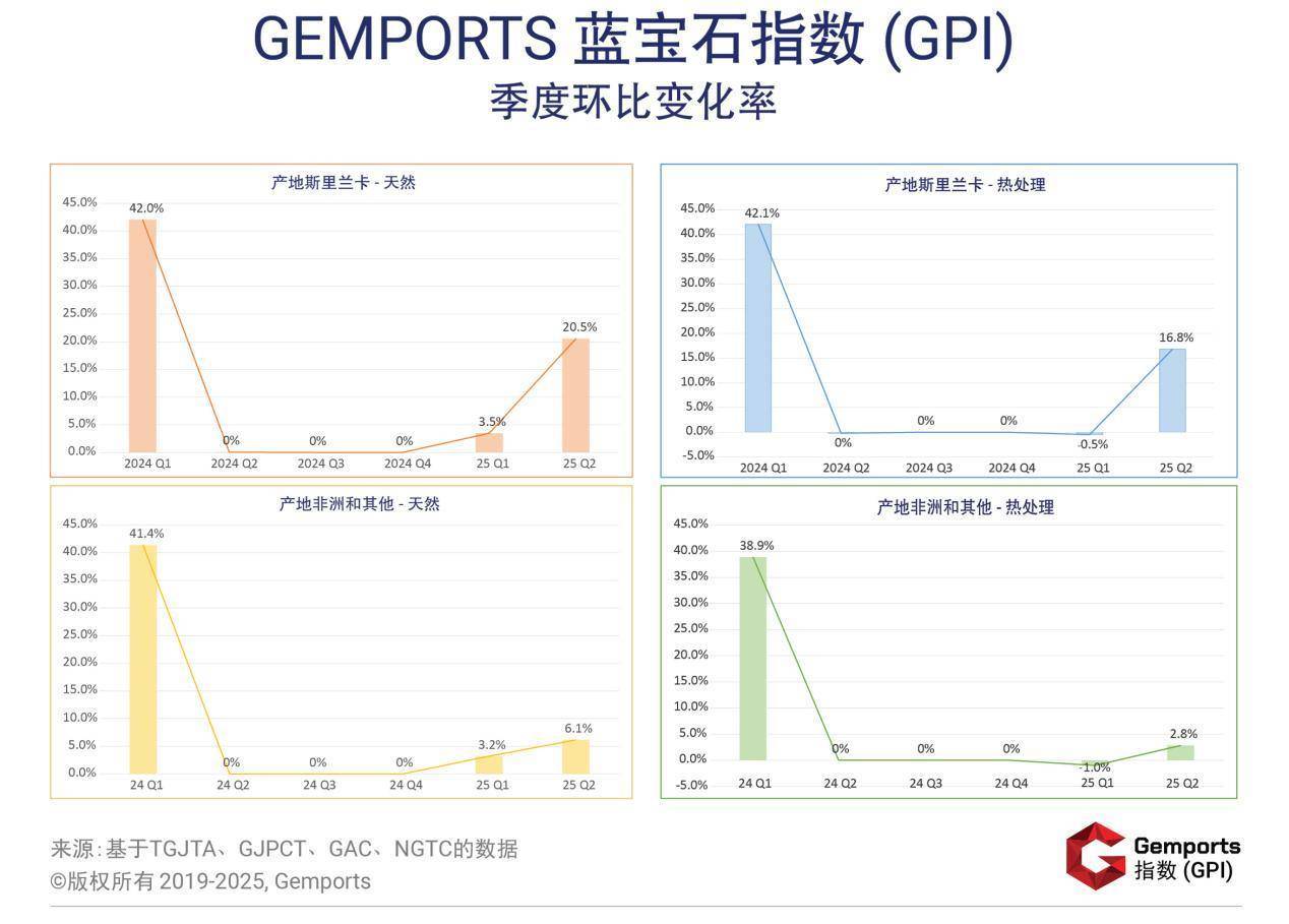 在经历了2024年的价格飙升之后,蓝宝石市场逐渐趋于理性,根据伟德国际吧GEMPORT发布的2025年蓝宝石指数(GPI)来看,今年第一季度“有烧”市场还略有下滑,但到了第二季度,无论是有烧还是无烧蓝宝石都有不同程度的上涨,特别是市场接受度较高的斯里兰卡产区,无烧蓝宝石增长了20.5%,有烧蓝宝石增长了16.8%。非洲及其他产区无烧蓝宝石也增长了6.1%,有烧增长了2.8%。