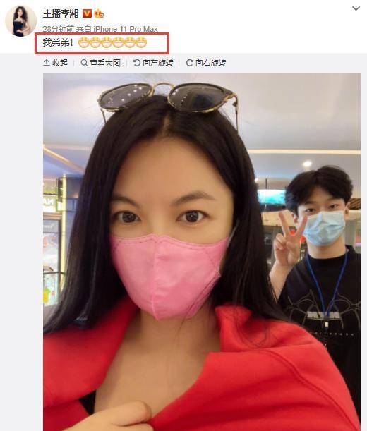 第三条里,李湘晒出与一位鲜肉男星的合照,亲切地称“我家弟弟”,估计是活动上认识的。她站在前面直面镜头,婚戒再次抢镜,粉色口罩和红色披肩搭配,手捏胸口衣服,确实瘦了不少,脸型更精致了。后面的弟弟戴着口罩,帅气逼人。